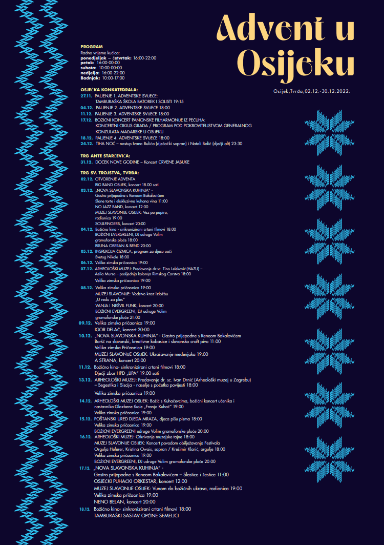 Bliži nam se najljepše doba godine kada grad obasja tisuće lampica, prožimaju mirisi slatkih i slanih uličnih jela i toplih napitaka i ispune zvuci blagdanske glazbe i veselja. Za samo tjedan dana, na Dan našeg grada, započinje Advent u Osijeku (02.12.-30.12.2022.) koji se vraća na svoju čarobnu lokaciju u baroknu jezgru Tvrđu. Grad na Dravi proslavit će svoj rođendan paljenjem više od 15 kilometara blagdanske rasvjete, najviše dosad!